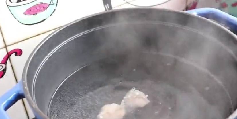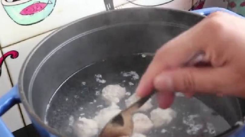 鍋中熱水,水不用燒開,看到有很多密集的小泡泡轉最小火,用手一擠,勺子一挖,一個一個地下入丸子,這樣丸子不易散開。