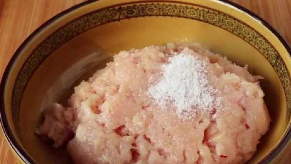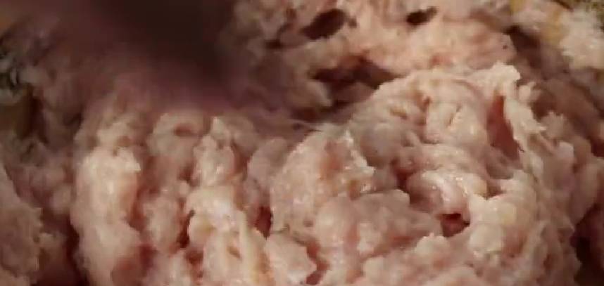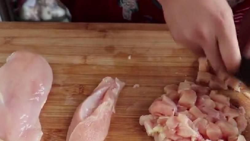 雞胸肉清洗幹凈,先切成條再切成小塊,放到絞肉機裡攪碎,沒有絞肉機就用刀剁成肉末。