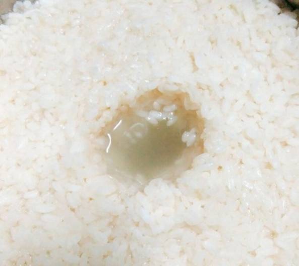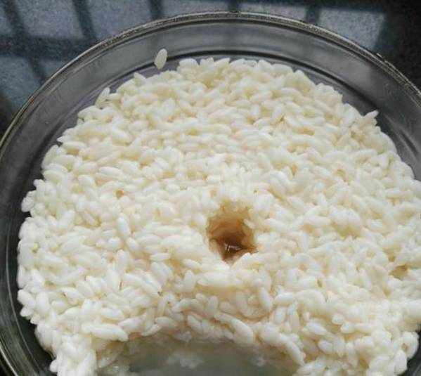 4、準備好一個釀酒的工具,最好是陶缸子或者玻璃缸,把糯米全部裝進去,用勺子將表面壓平,再在中間挖一個圓孔,再把容器密封好,擺放在室溫環境下。