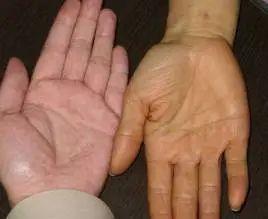 手掌血色變得不均勻,大拇指和小指根部的大小魚際處出現