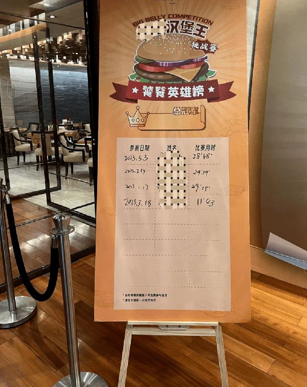 截至目前,酒店共舉辦瞭三場挑戰賽,共有37人參加瞭“漢堡王挑戰賽”,4人完成挑戰。