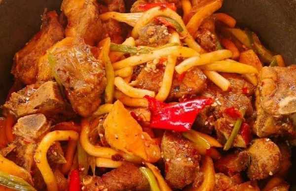 (2)炕鍋羊排,燉鍋內放入羊肉、蔥、薑、料酒,加水大火燒開後,改小火燉,蔥、薑、蒜熗鍋,加入洋蔥煸炒至時尚,再加入胡蘿卜塊,調入孜然、花椒、五香、鹽等充分炒勻,起鍋前加入青紅椒,香美入味。
