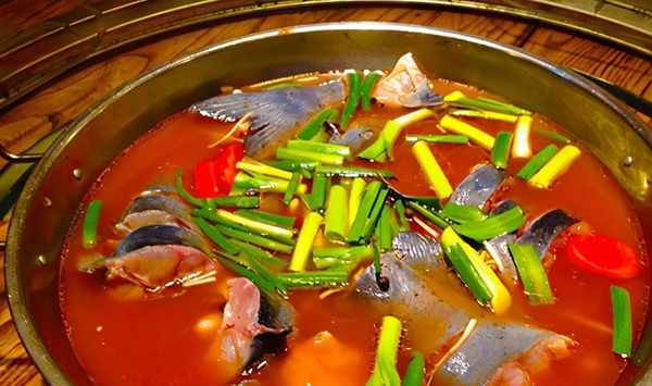 我們制作酸菜魚的湯料的做法很特別:鍋內放入大豆油150克、熟豬油30克燒熱,下入蔥末、薑末、蒜末各5克爆香,下入酸菜段300克、黃燈籠辣椒醬10克、切片的毛粉紅番茄150克,中火將番茄炒爛,倒入燒沸的魚湯1500克,大火持續加熱5分鐘即可。由於加入瞭新鮮番茄,所以做好的湯料酸味更清爽。