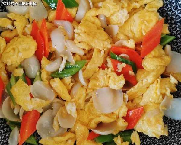 3、另起油鍋,下入青椒和胡蘿卜塊,翻炒出香味,再下入百合,翻炒片刻,下入蛋塊,翻炒均勻,下入鹽和糖調味,出鍋,完成。