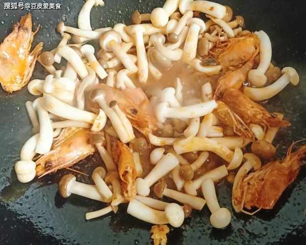 3、另起油鍋,放入蝦頭,煸炒出蝦油,這樣有濃厚的蝦香。把蝦頭丟掉,放入蟹味菇和白玉菇,翻炒軟。