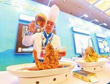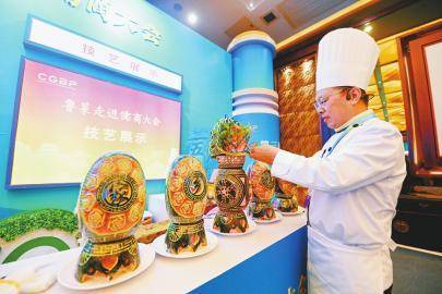 第三屆儒商大會召開期間,除瞭重量級的嘉賓、高規格的論壇,還舉辦瞭特色活動“傢鄉的味道——魯菜走進儒商大會”。3月28日,山東16市的各色美食亮相山東大廈,以“集大成者”的姿態展示山東飲食文化。在宴席展位,孔府宴、大舜宴、博山四四席、膠東漁傢宴等山東特色宴席集體亮相。在16市特色菜展示區,來自山東各地的特色美食將展現“舌尖上的山東”的魅力。濟南的創新版“糖醋鯉魚”、青島的“油爆活海螺”、淄博的“博山豆腐箱”、棗莊的“棗莊辣子雞”、煙臺的“福山大面”、臨沂的“臨沂雞肉糝”、德州的“魯小吉扒小雞”、濱州的“紙皮包子”……色香味俱全的傢鄉美食,蘊含著深厚的歷史文化,匯聚起海內外山東人情系故鄉、報效桑梓、創新創業的奮進力量。 (王汗冰攝)