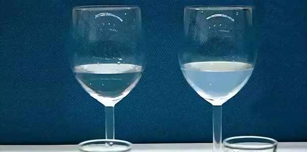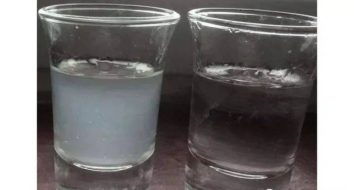 水的硬度大小是由水中所含鈣、鎂等金屬離子所決定的,一些金屬離子所對應的鹽類僅溶於水而不溶於酒精,所以水加入酒中後,部分金屬鹽類溶解度降低而析出,形成白色沉淀,像碳酸鈣或碳酸鎂是白色沉淀;還有些金屬離子與酒結合時,其同酒中的有機酸發生反應而形成白色沉淀,或針狀結晶析出,像乳酸鹽類;還有一些氯化物、硫酸鹽等粉狀的白色物體。