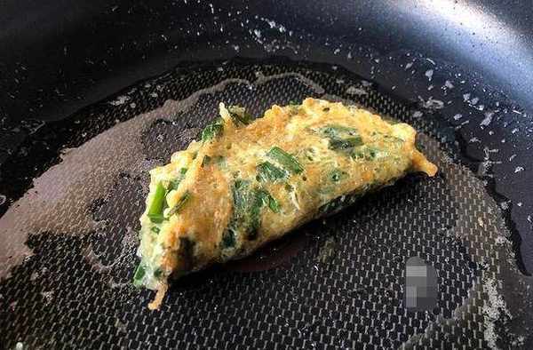 平底鍋加熱之後刷上一層油,然後我們舀一勺粉絲韭菜雞蛋液,這樣攤成圓餅的形狀,等到底部固定成型之後,我們將餅對折起來形成一個半圓的形狀,然後小火煎制完全固定成型就可以出鍋瞭。