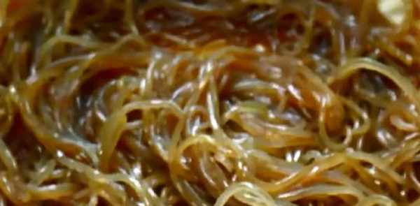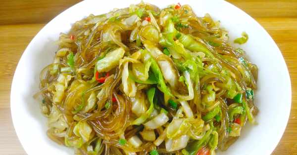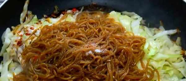 4.30秒後往裡面加入處理好的粉條,加入生抽、精鹽調味。蓋上蓋子用中火燒制20秒。20秒後淋入一勺水淀粉快速的翻拌均勻就可以出鍋食用瞭。
