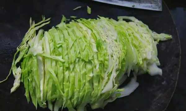 1.首先準備新鮮的包菜一個從中間切開,然後用刀給它切成細絲。放在清水中給他沖洗幹凈瀝幹水分放入碗中備用。準備紅薯粉條一小把放在溫水中浸泡半小時。