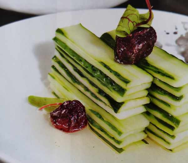 制作流程:1.調話梅汁:冰糖250克碾成粉納盆,放蜂蜜250克、蘋果醋500克攪拌至均勻融化,投入九制話梅30顆,浸泡2.5小時至出味即可使用。2.水果黃瓜洗凈瀝幹,切去兩端,改刀成厚約0.3厘米、長約8厘米的片,取黃瓜片200克裝碗加冰塊靜置半小時,控幹水分後放進調好的話梅汁中翻拌、浸泡5話梅爽脆青瓜用九制話梅、蘋果醋、冰糖粉、蜂蜜調制一款料汁,泡入水果黃瓜,果肉掛勻湯汁,酸甜脆嫩,既可餐前開胃,亦能餐後清口。這款料汁還可用於浸泡其他口感爽脆、味道清淡的食材,例如嫩藕、蘋果等,舉一反三,一汁多用!制作流程:1.調話梅汁:冰糖250克碾成粉納盆,放蜂蜜250克、蘋果醋500克攪拌至均勻融化,投入九制話梅30顆,浸泡2.5小時至出味即可使用。2.水果黃瓜洗凈瀝幹,切去兩端,改刀成厚約0.3厘米、長約8厘米的片,取黃瓜片200克裝碗加冰塊靜置半小時,控幹水分後放進調好的話梅汁中翻拌、浸泡5分鐘,撈出碼入盤內,淋話梅汁35克,點綴花草和九制話梅2顆即可走菜
