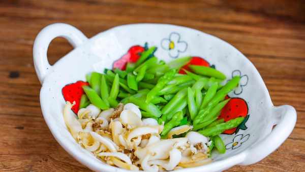 4、鍋裡水開之後,加一勺鹽,放一點油,把鮑魚放進來焯水20秒,撈出過冷水,蘆筍也焯水一分鐘,也要過一下冷水。瀝幹水份裝在一起。