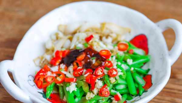 5、加入蔥蒜,小米椒,淋入熱油,再放入蒸魚豉油,蠔油,攪拌均勻 就可以開吃瞭,簡單快手的涼拌菜,而且低脂低卡。蘆筍是非常好的漂亮食材,搭配鮑魚一起,氣質絕瞭。