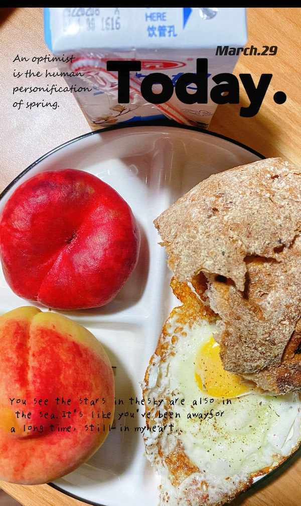 牛奶一盒、裸麥面包一塊、蟠桃一個、十四號桃子一個、荷包蛋一個。