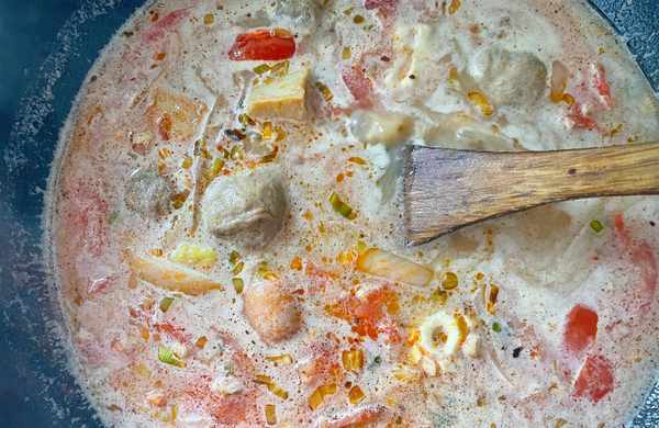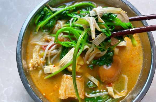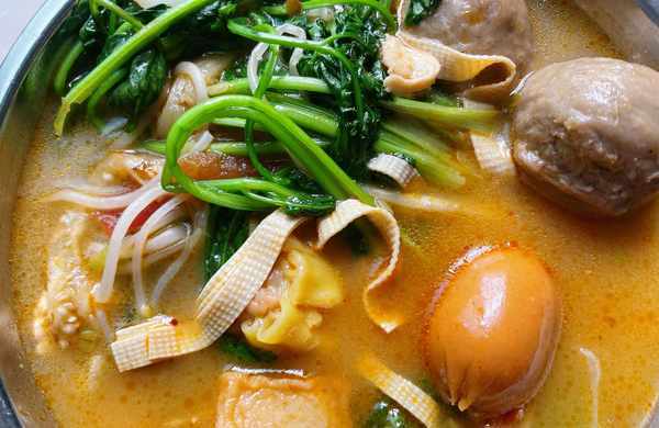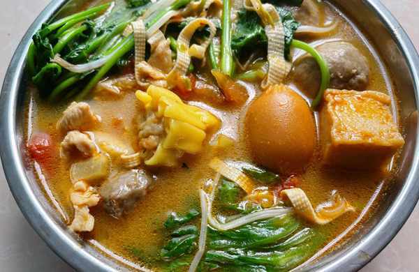 主要食材:火鍋丸子、雞肉、豆腐皮、青菜、綠豆芽、金針菇、茄條、洋蔥、番茄、蔥、蒜、薑