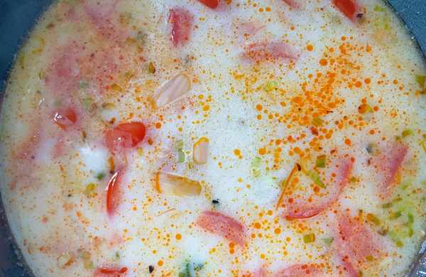 6.此時倒入番茄,炒出番茄汁,加500ml純牛奶,再加入2碗水,放入一塊火鍋底料,大火開煮。