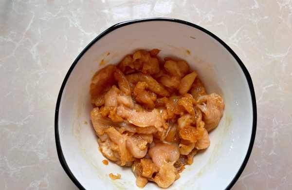 2.準備的雞身材肉,切成薄片提前加入少量生抽與淀粉醃制。
