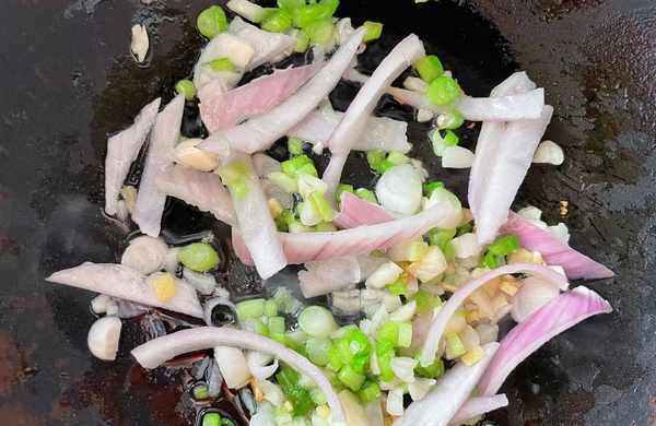 5.鍋中放入適量食用油,先放蔥、薑、蒜、洋蔥絲爆香。