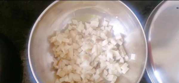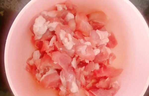 再把婆婆買來的豬肉也切成小塊的,放到小碗裡,待用。