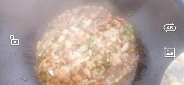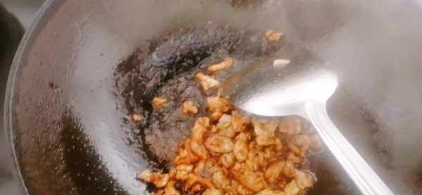 把肉放進去,放入十三香、雞精、鹽、醬油,然後炒出肉的香味。