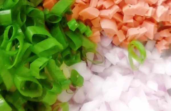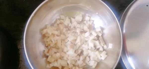 把火腿,洋蔥切成丁,把蒜、蔥、生薑都準備好,放到一個碗裡,看著顏色搭配的還可以。