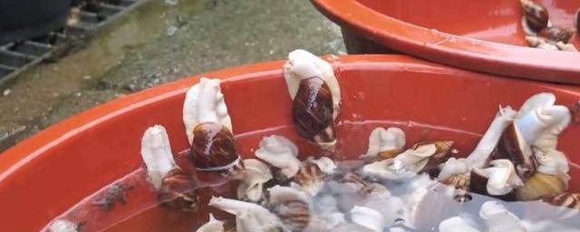 這裡是位於國外的一傢蝸牛養殖場,這裡的蝸牛一般是養殖六個月就可以食用瞭。購買後的蝸牛要先放在水裡面泡一下,然後用開水煮熟,煮熟以後要把蝸牛肉給取出來,這個肉還是挺大的,取出的蝸牛肉用工具將不能食用的部分處理幹凈。