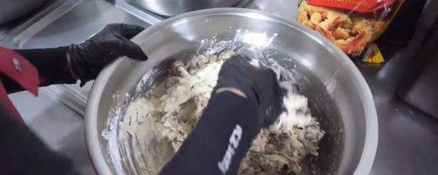 現在是準備其他配料,薑、紫蘇葉和韭菜切碎,洋蔥磨成泥狀,接著倒入半袋面粉和少量淀粉,把剛剛切的配菜和洋蔥你也加進來,接下來再倒入啤酒,這還是第一次見,用啤酒來和面,這種做法還挺特別的,把醃制好的蝸牛肉放上面包屑和淀粉攪拌均勻,你別說他的整個制作過程還真挺繁瑣。