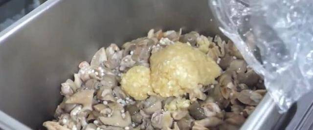 接下來就是將這些蝸牛肉醃制一下,蒜末、薑粉、洋蔥汁全部倒裡面,還有胡椒粉跟咖啡粉攪拌均勻以後,需要醃制三個小時。