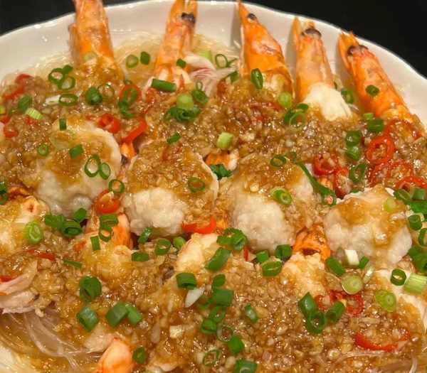 3.醬汁淋在蝦背上,加一點點水,水開蒸7分鐘左右,然後撒上蔥花即可。