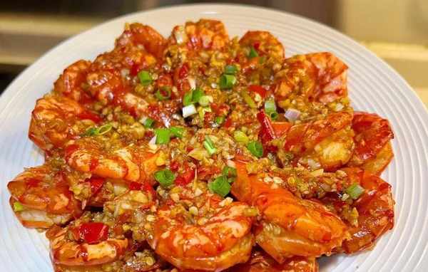 2.蝦剪須開背,撒一點點淀粉,油熱下大蝦炸,炸至金黃,途中用鍋鏟壓下 蝦頭,會出蝦油,炸好蝦扒拉一邊,放蒜末和辣椒炒香(不吃辣可不放辣椒),再和蝦一起翻炒,倒入料汁,燜5分鐘,最後撒蔥花即可。