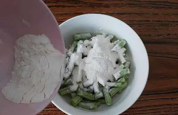 第二步:把豆角洗凈後撒上準備好的面粉拌勻,如果太幹的話可以加一點水,讓豆角都能裹上面粉最好。然後放到鍋裡蒸10分鐘左右後出鍋,攤開晾涼。