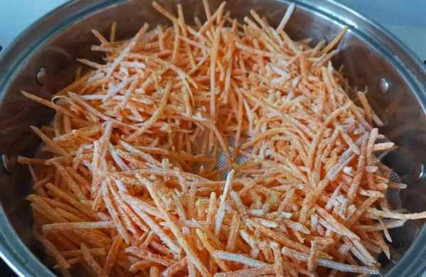 第二步:將切好的蘿卜絲晾幹後拌上玉米油,用手翻拌均勻。再將準備好的淀粉倒進去拌勻,讓每根胡蘿卜絲都沾上淀粉。