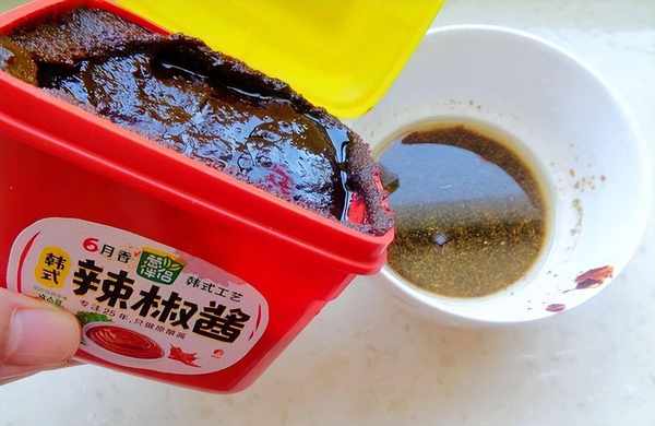 3、取一小碗,加生抽和韓式辣椒醬,孜然粉、植物油拌均勻