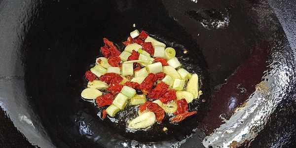 【步驟五】:炒鍋燒熱,放入1勺油燒熱,放入大蒜、大蔥、幹辣椒,小火炒出香味。
