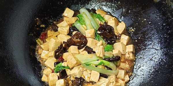 (5)豆腐重新下鍋翻炒的時候最好的顛勺,不要用勺子翻動,防止把豆腐炒碎。