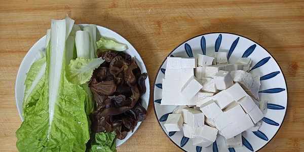 【步驟一】:把豆腐改刀切成1-2厘米左右大小的塊、泡發木耳摘洗幹凈、小白菜清洗幹凈切成長段,裝盤備用。