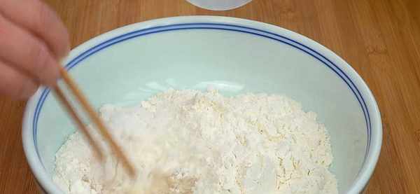 1.盆中加入360克面粉,加入3克酵母,20克白糖,用190毫升的牛奶和面,先倒在酵母的位置,把它攪散。然後再把面粉攪拌成面絮狀。