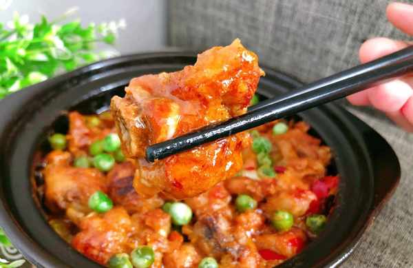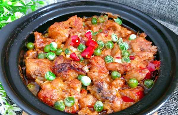 (8)接著最上面放煎好的雞肉,再撒少許豌豆和洋蔥丁,淋上調好的料汁,蓋上蓋子小火燜煮15分鐘,完成
