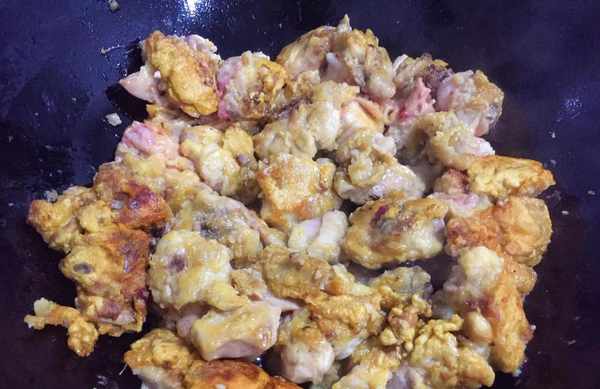 (5)另起鍋倒油,放入醃制好的雞塊,攤平開小火慢煎,煎至兩面金黃色即可