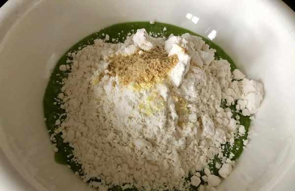 (3)打好後倒入盆中,加適量鹽,五香粉,雞精調味,再分多次倒入面粉,一邊加一邊攪拌