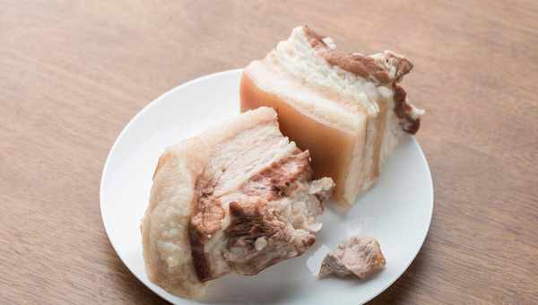 1、準備一塊五花豬肉,不用去皮也不用切開,冷水下鍋,加入料酒和蔥薑,煮20分鐘