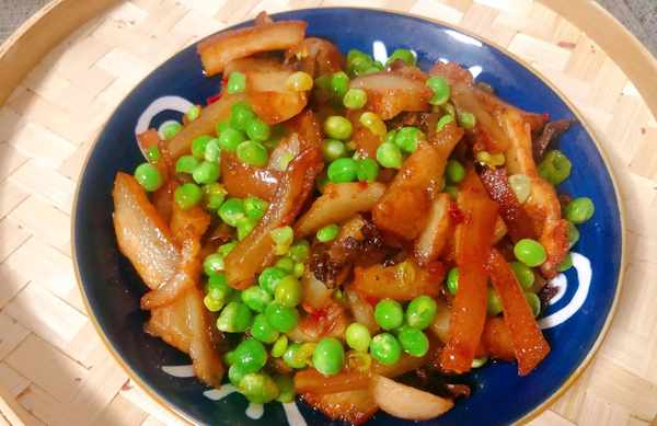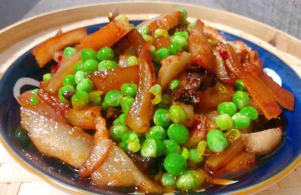 《所需食材》豌豆、豬五花肉一小塊兒、青椒1個、木耳3朵、鹽、糖、雞精、蠔油、老抽