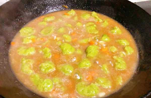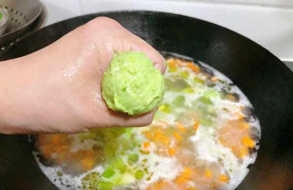 (7)燒開後準備下丸子,手上蘸水,用左手虎口處擠出丸子,右手取下來下入鍋中,下到一半用勺子推動一下鍋底,防止粘鍋,丸子不需要太大,小小的更入味