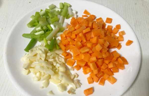 (5)接下來切點配菜,大蒜拍碎剁成蒜末,小蔥切成蔥花,半根胡蘿卜切成小方丁