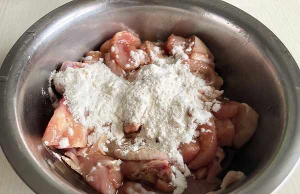 (1)首先將雞腿剁成小塊兒,清洗幹凈把水分控幹,加料酒,雞精,胡椒粉,鹽,糖,老抽攪拌均勻