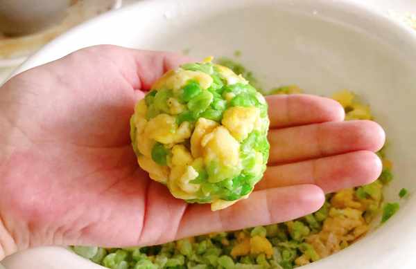 (5)攪好後,抓一團攥成圓形,捏得緊實一些防止散開,如果不容易成團就是面粉加少瞭,適當地添加一些,不要一次添加太多