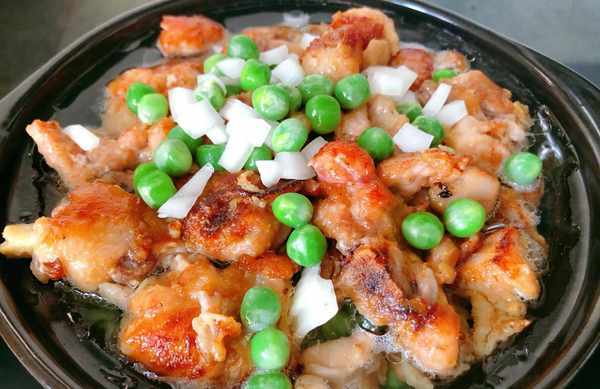 《食材》雞腿2個、洋蔥1個、豌豆2把、面粉適量、大蔥、料酒、雞精、胡椒粉、鹽、糖、老抽