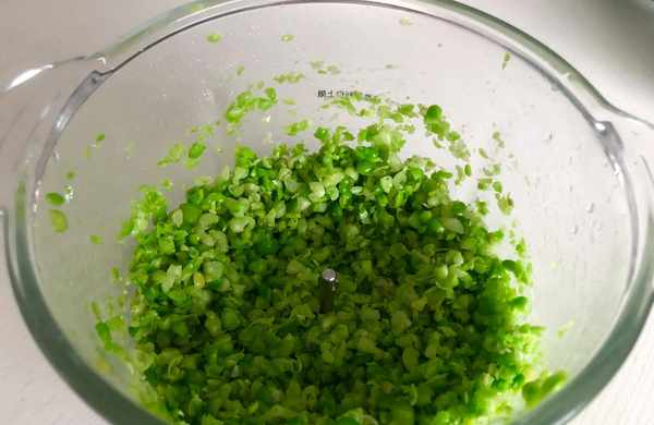 (3)下面處理碗豆,綽水後顏色看起來明顯綠瞭很多,接著倒進絞肉機,打成豌豆顆粒,倒進盆中,把剛才炒好的雞蛋一起倒進去