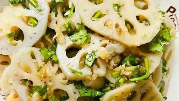 食材:蓮藕,蒜末,生抽,香醋,食鹽,白糖,雞精,香菜,香油,料油。