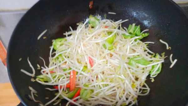 3、鍋裡油熱,放入花椒,倒入蔥薑蒜和青紅椒,爆出香味兒,倒入綠豆芽,大火翻炒60秒加食鹽,生抽香醋繼續大火爆炒60秒,最後從鍋邊淋入香醋和明油即可裝盤出鍋